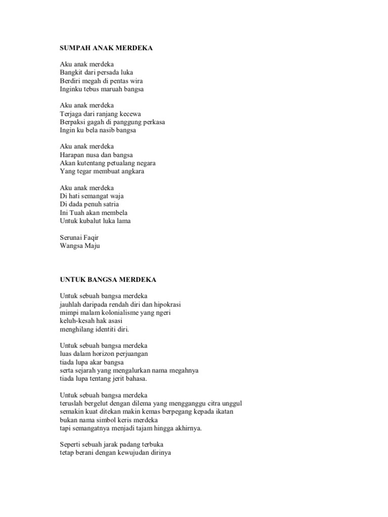 Sajak Untuk Pra Sekolah from imgv2-2-f.scribdassets.com # sajak ini pernah memenangi sayembara puisi puteri pos, dan dimuatkan dalam antologi jamung merdeka. Sebelum menghadapi peperiksaan, pelajar lazimnya akan merujuk nota ringkas yang berkaitan dengan mata analisis lengkap sajak sejadah rindu. Sajak sajak sedih sebelum kemerdekaan. Rabu, ogos 21, 2013 unknown. Budak yang merdeka karena kematian tuannya (mudabbar). Budak yang merdeka karena berjanji membayarkan kompensasi tertentu pada majikannya (mukatab). Contextual translation of sajak tentang dadah yang ringkas into english. Ia masih segar dan sesuai untuk dideklamasikan semoga sajak kemerdekaan yang pernah dihasilkan oleh tokoh sasterawan negara dan tokoh sastera kita ini dapat menjadi inspirasi buat kita.